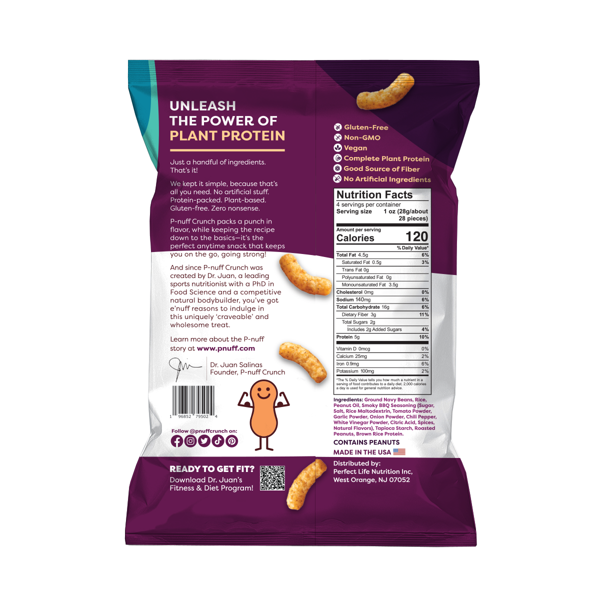 Baked Peanut Puff Snack - Savory BBQ Flavored. The craveable, crunchy puffs you love, made with healthy ingredients! The perfect go-to snack for school, the office, travel, indoor or outdoor activity and more. Only 120 calories and 2g of sugar per 1oz serving and Complete plant-based vegan protein that helps you build muscle and stay lean! Contains slow digesting complex (good) carbohydrates for sustained energy and staying active. 3g of fiber for satisfaction and overall health. Non-GMO, gluten free, vegan, all natural ingredients, complete plant-based protein.