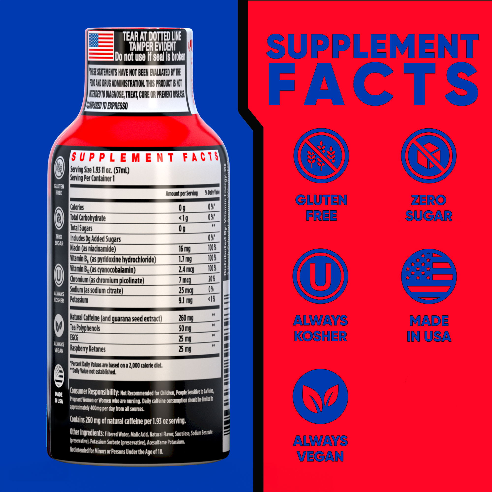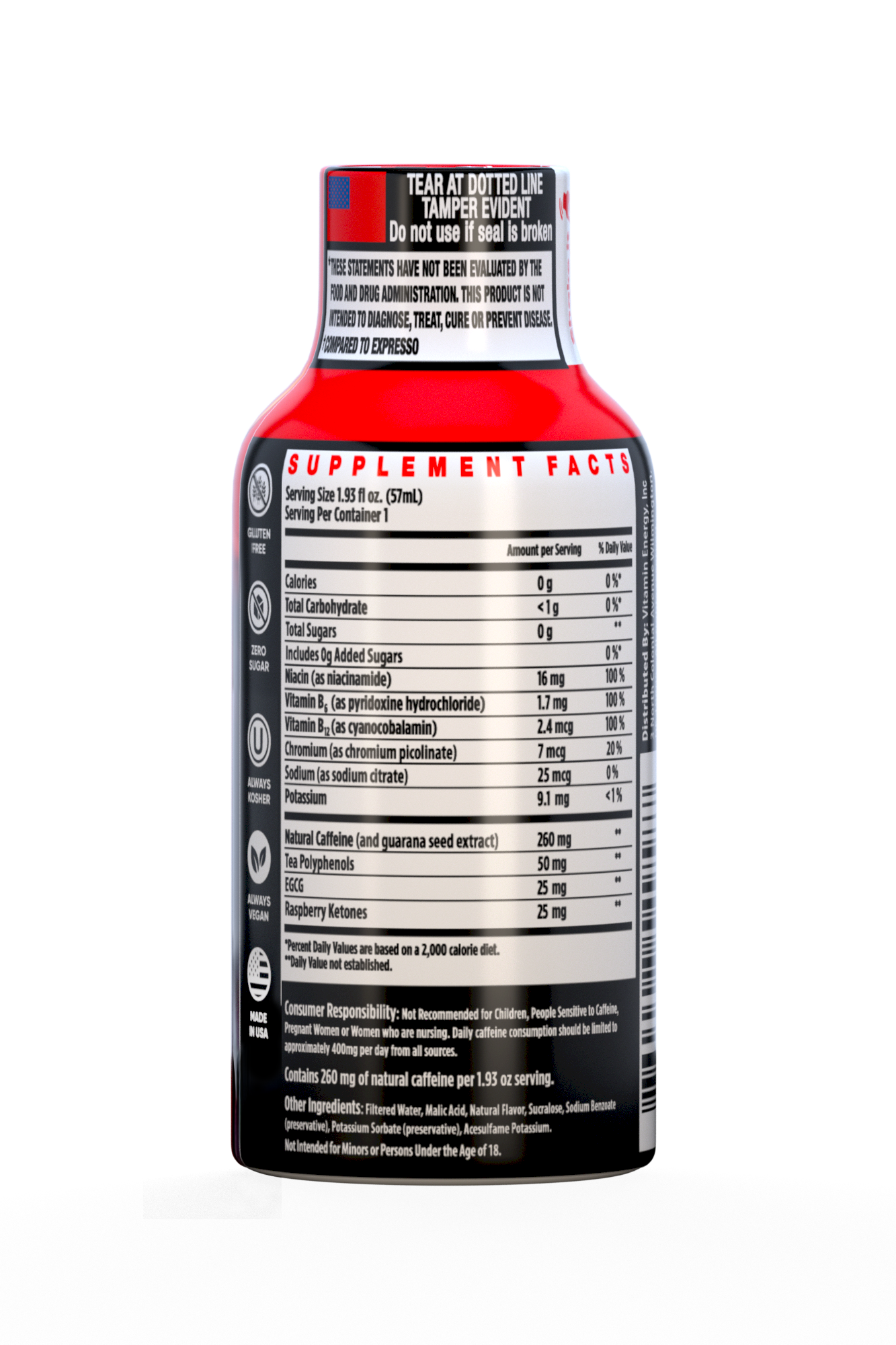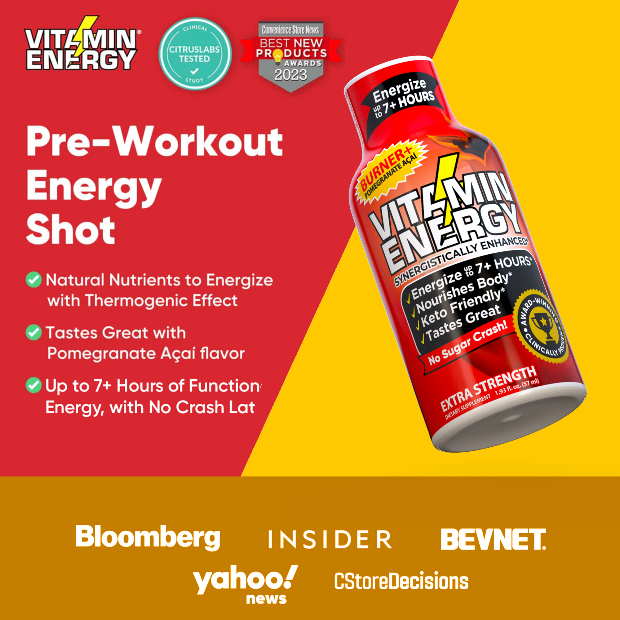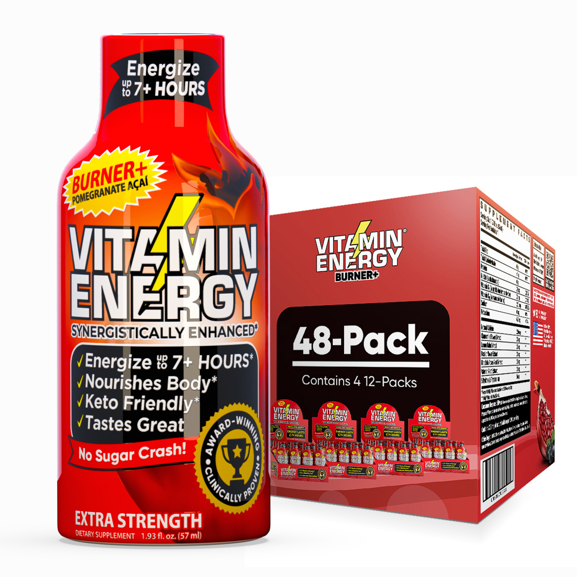 The Vitamin Energy® Burner+ Acai Pomegranate shot (1.93 fl. oz.) is our first thermogenic fat burner that supports healthy weight loss. Each shot is sugar free and made with natural caffeine to leave you energized for up to 7+ hours, with no crash later. Kosher, Keto, & Vegan-Friendly.