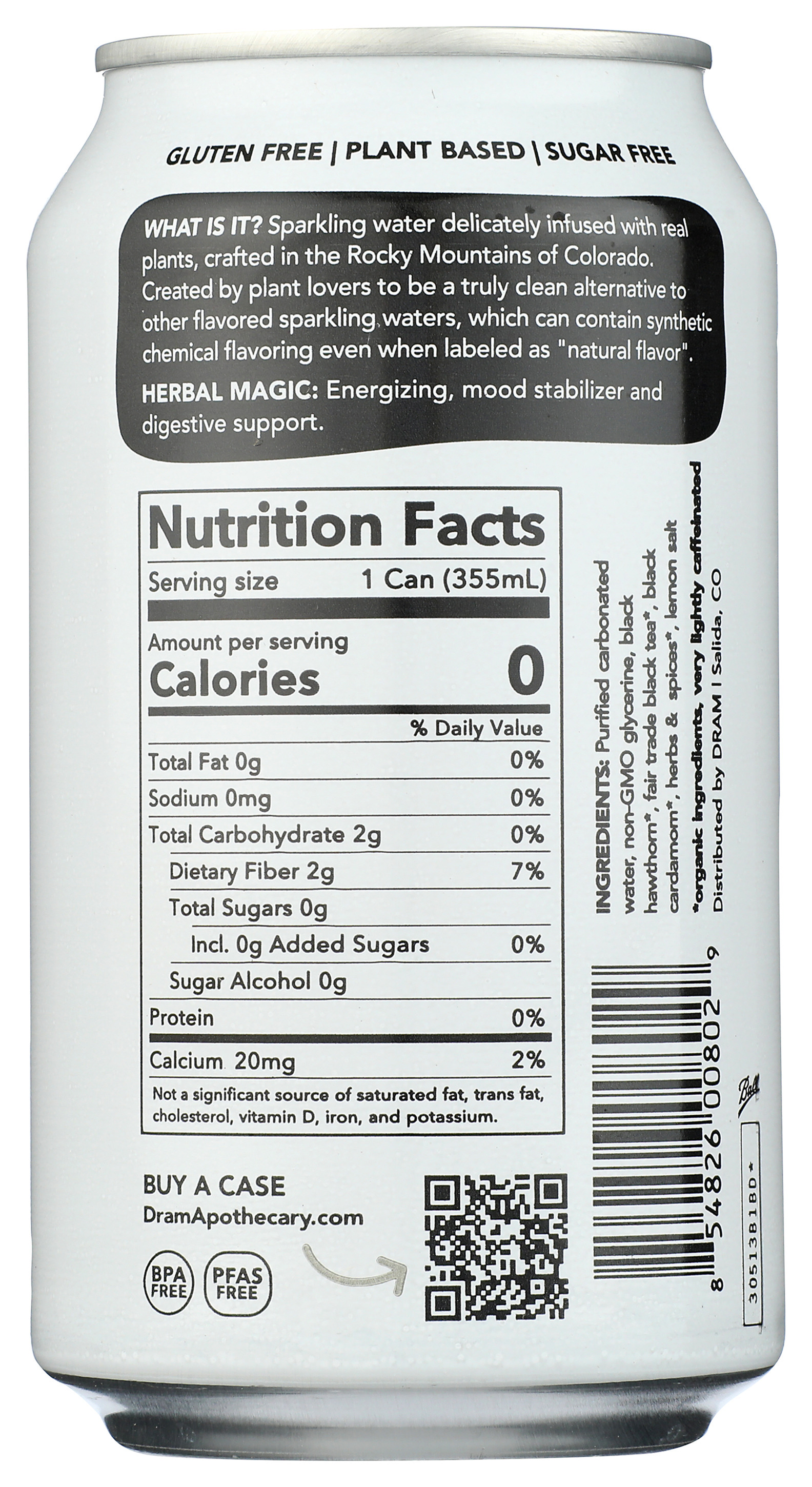A lightly energizing sparkling water infused with bright notes of cardamom, earthy black tea and a subtle hint of black pepper. Crafted in the Rocky Mountains using 100% organic and natural herbal bitters. NO preservatives, artificial color or so called “natural flavorings.” Light and bubbly with a hint of herbal goodness, these are perfect enjoyed cold out of the can or used as a mixer for cocktails. May also be employed to settle an upset stomach or enjoyed after a meal to stimulate digestion. Caffeine content is comparable to 1/4 cup of black tea.