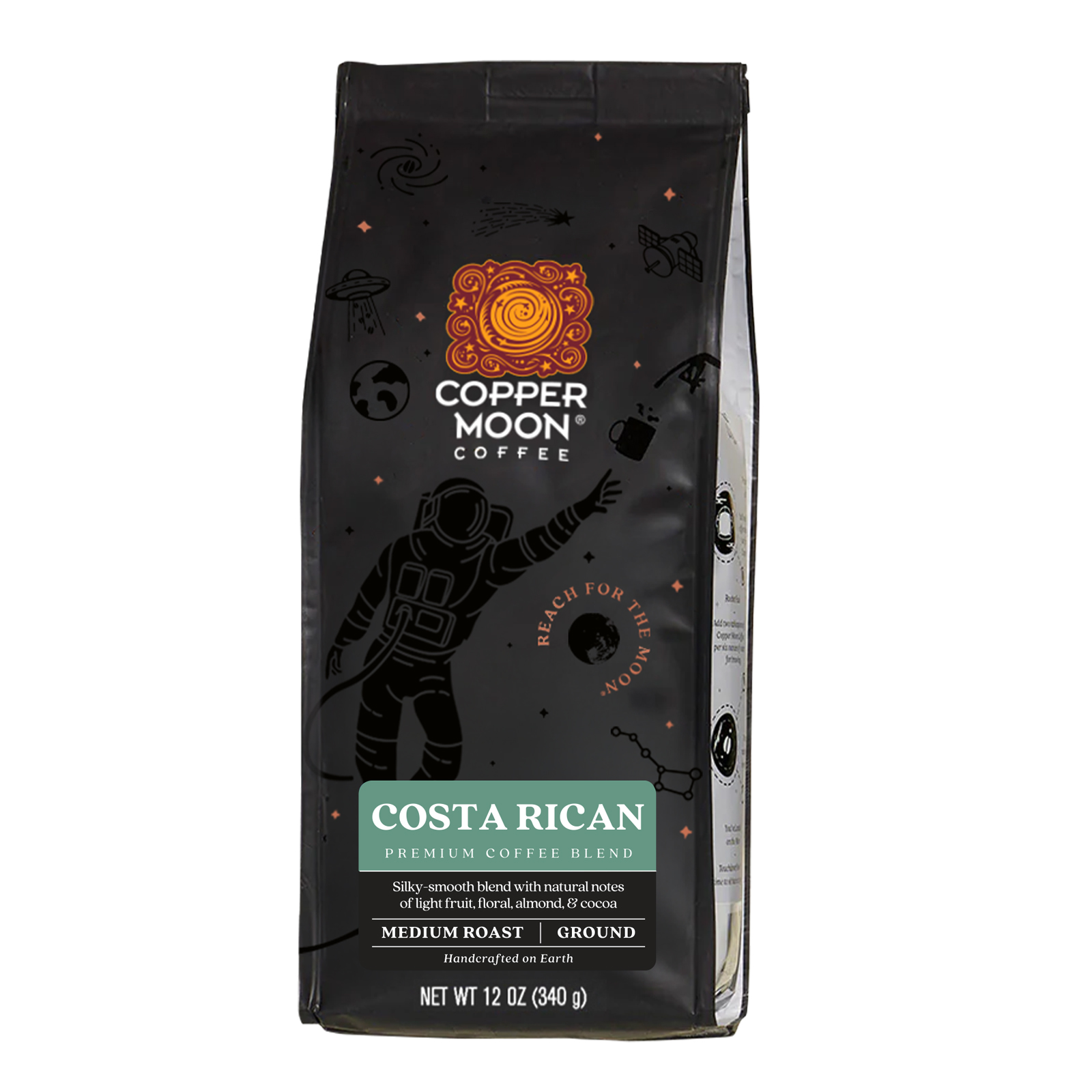 Copper Moon Coffee Costa Rican Premium Coffee Blend is silky-smooth with a sweet and smoky bouquet, a nice bright wine-like profile and an eloquent finish. We sustainably source this blend from various farms with perfect growing conditions in the rich volcanic soils of Costa Rica in Central America.