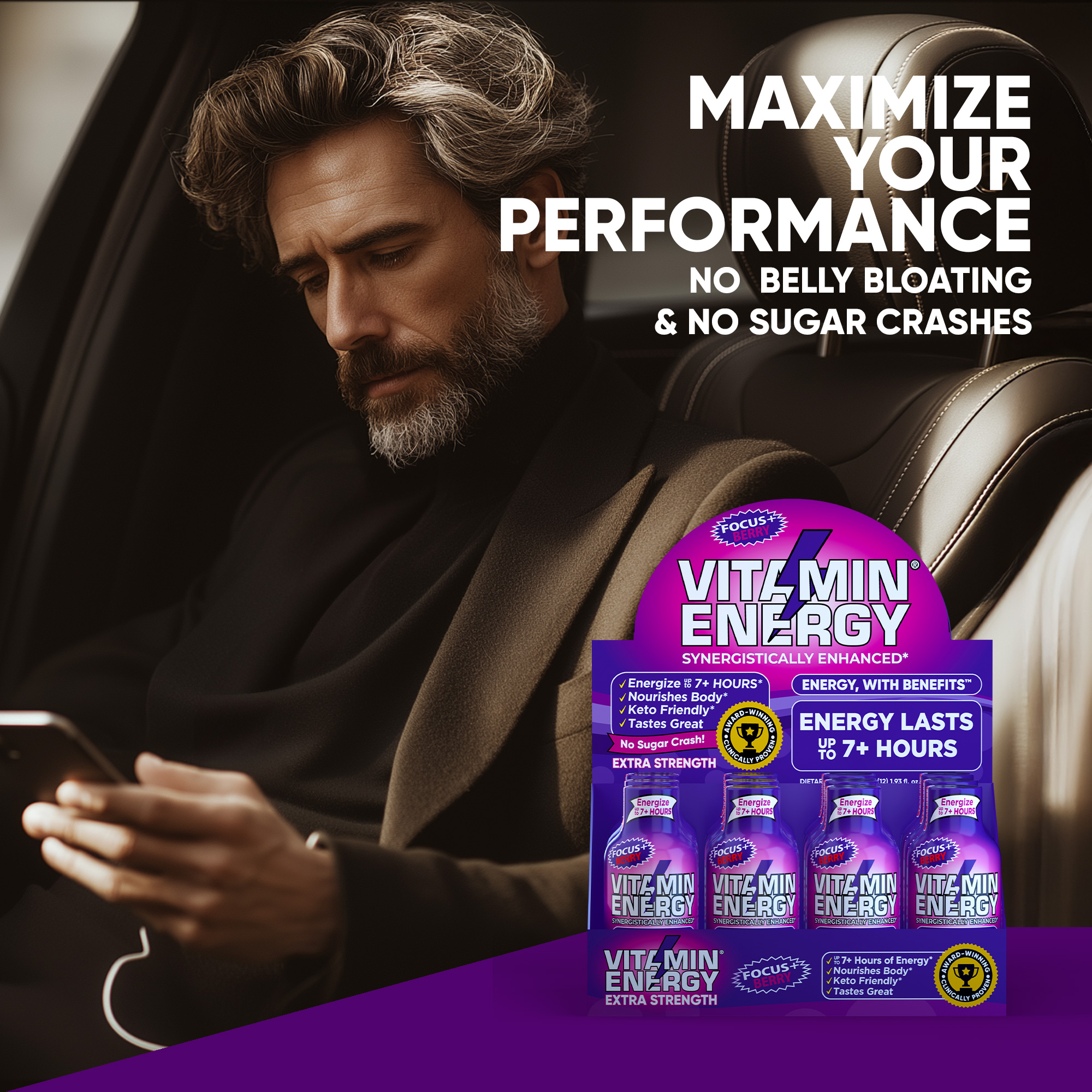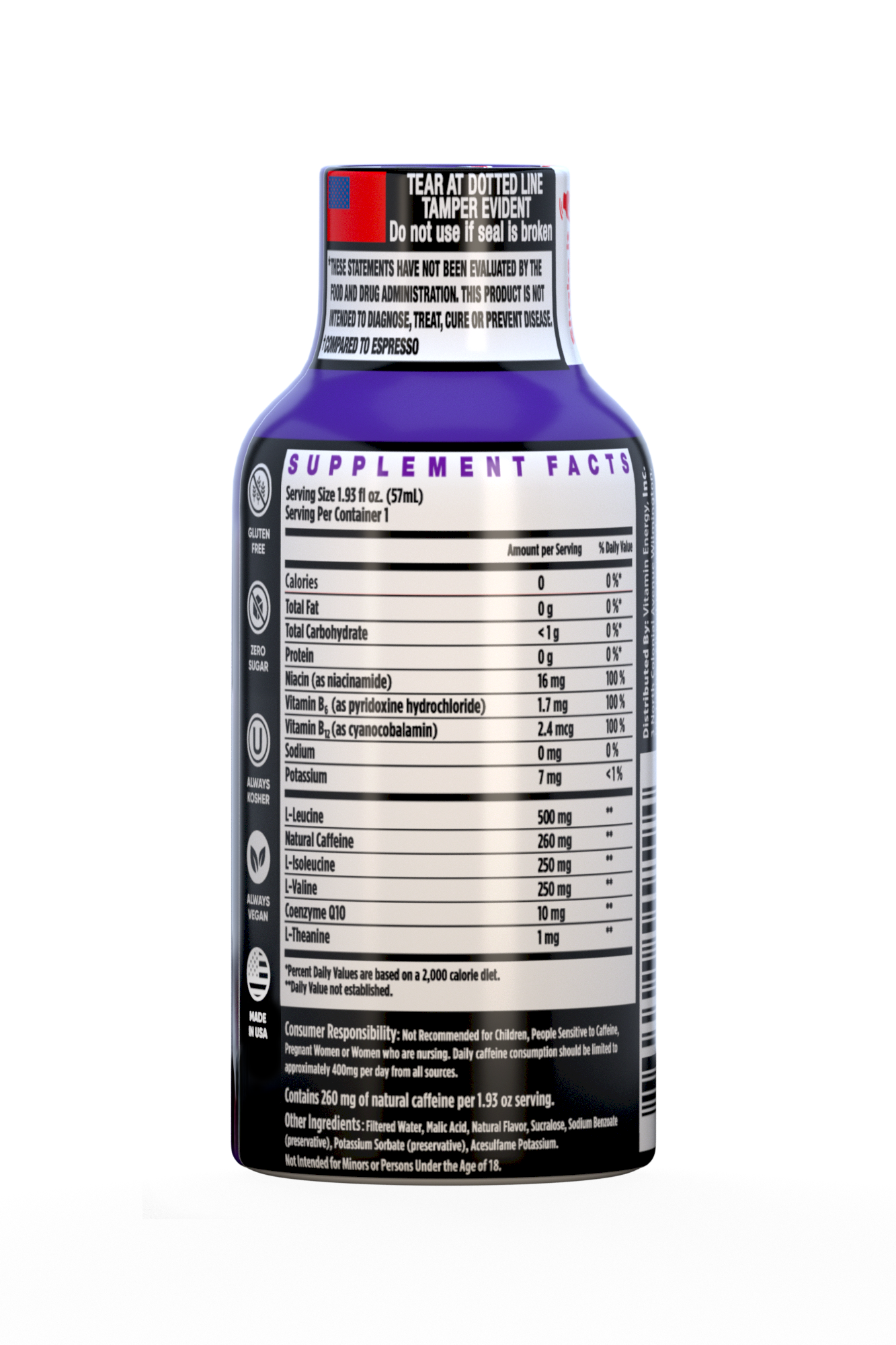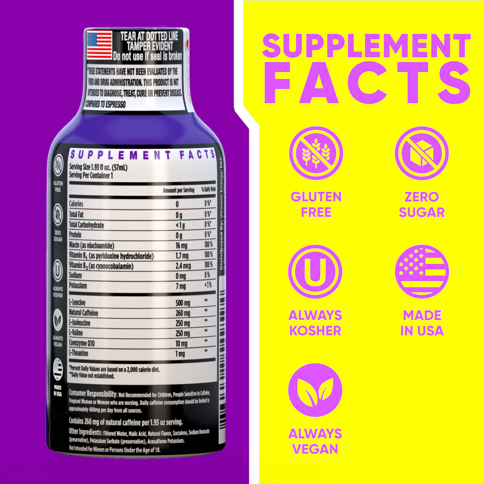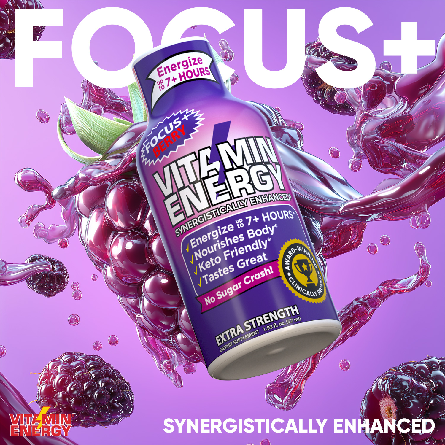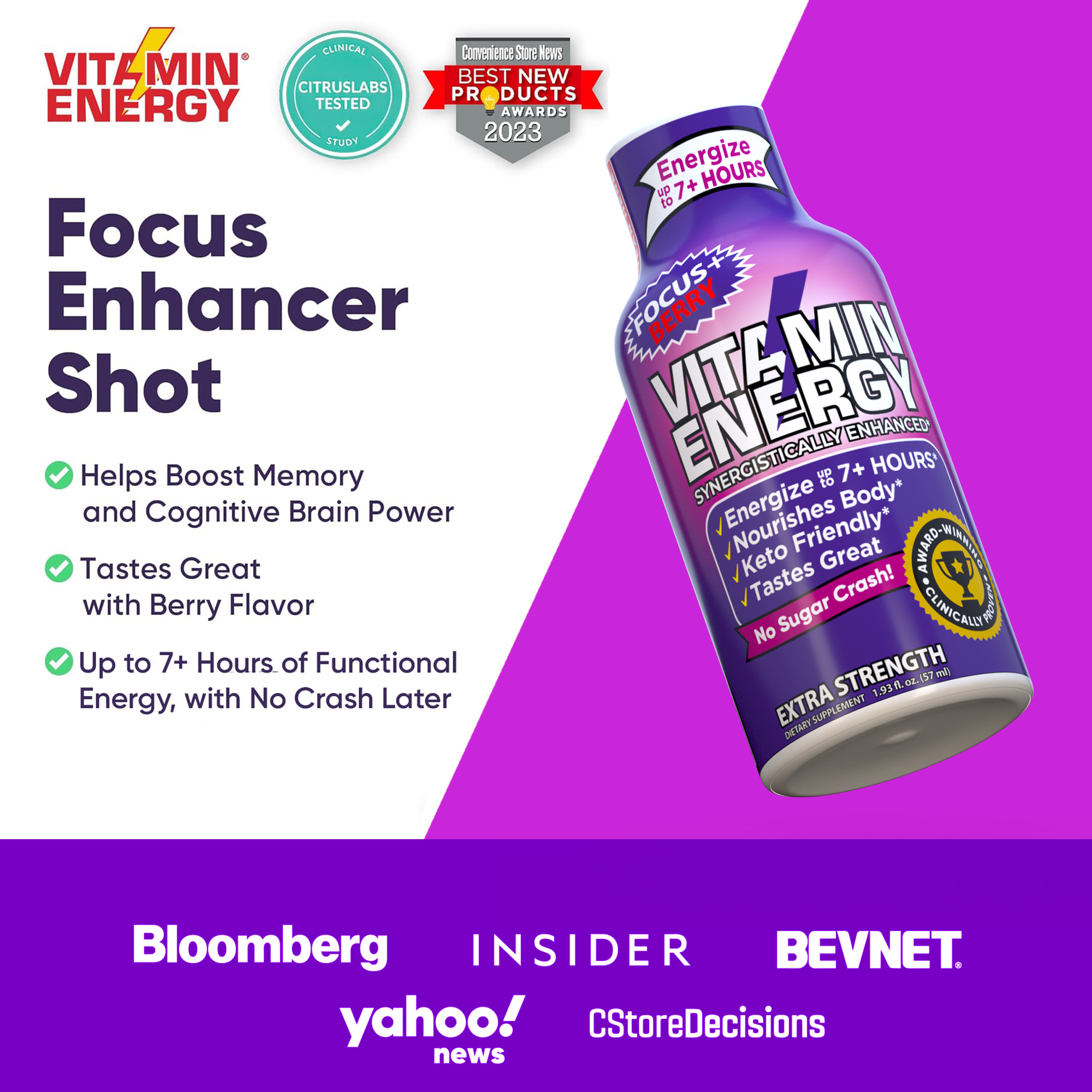 The Vitamin Energy® Focus+ Berry shot (1.93 fl. oz.) helps boost memory, concentration, and cognitive focus by using various brain supporting vitamins and supplements, while providing up to 7+ hours of naturally caffeinated energy. Improve your brain power and energy in one convenient step. No Sugar. Kosher, Keto, & Vegan-Friendly.