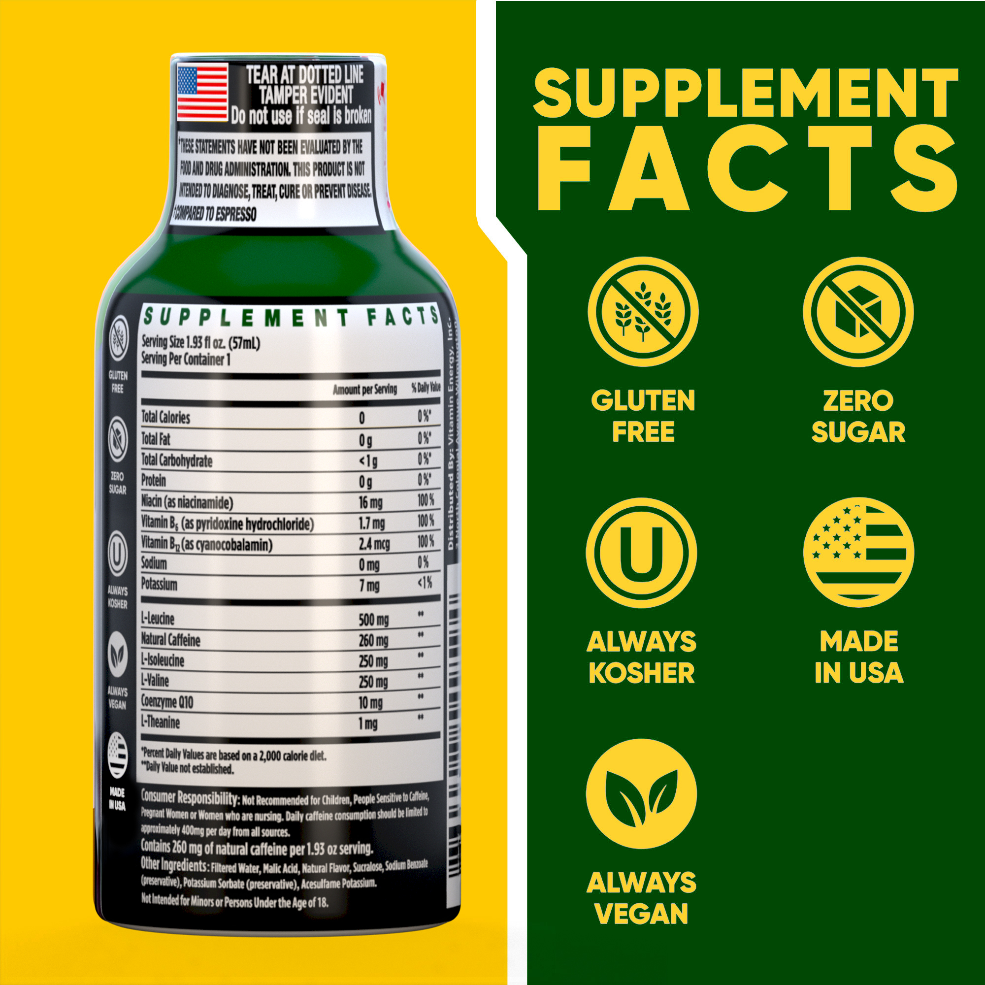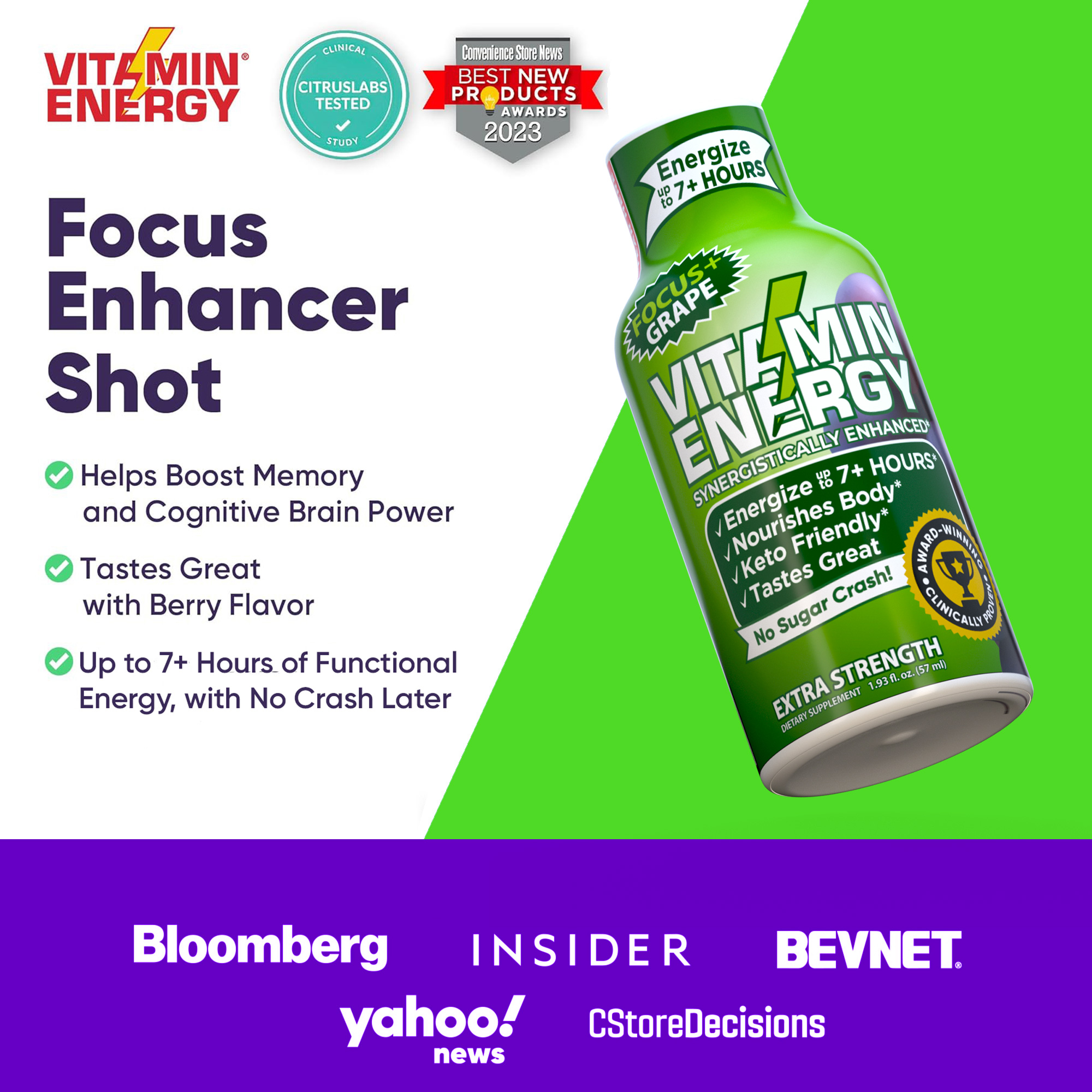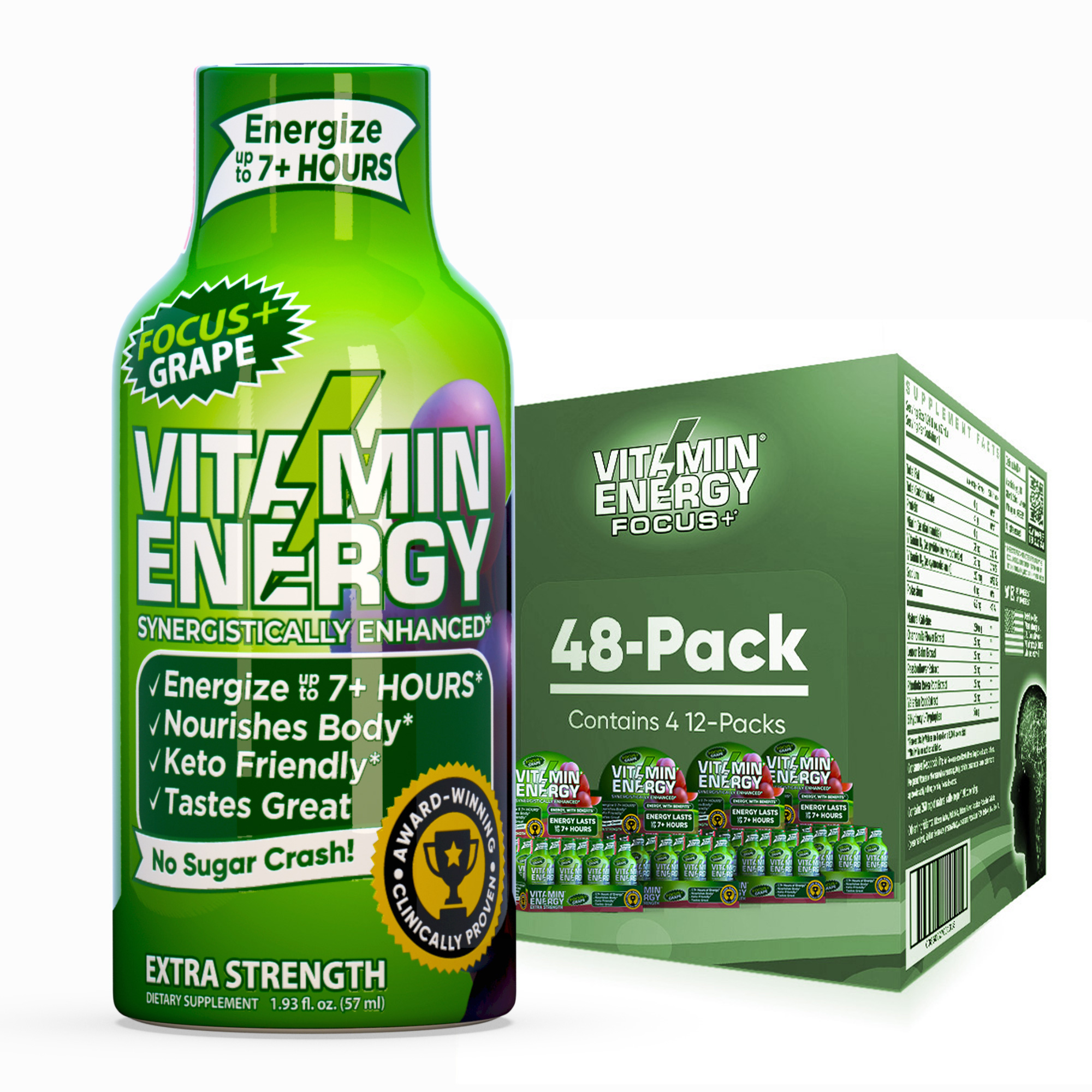 The Vitamin Energy® Focus+ Grape (1.93 fl. oz.) helps boost memory, concentration, and cognitive focus by using various brain supporting vitamins and supplements, while providing up to 7+ hours of naturally caffeinated energy. Improve your brain power and energy in one convenient step. No Sugar. Kosher, Keto, & Vegan-Friendly.