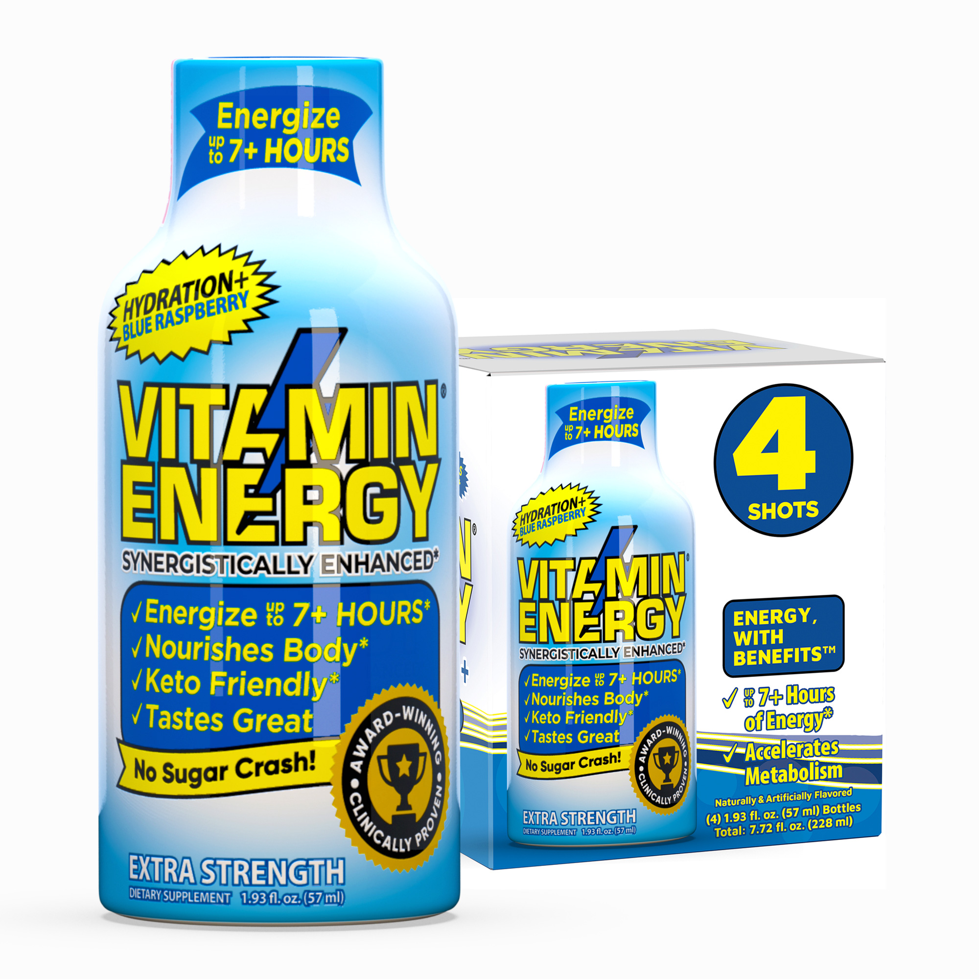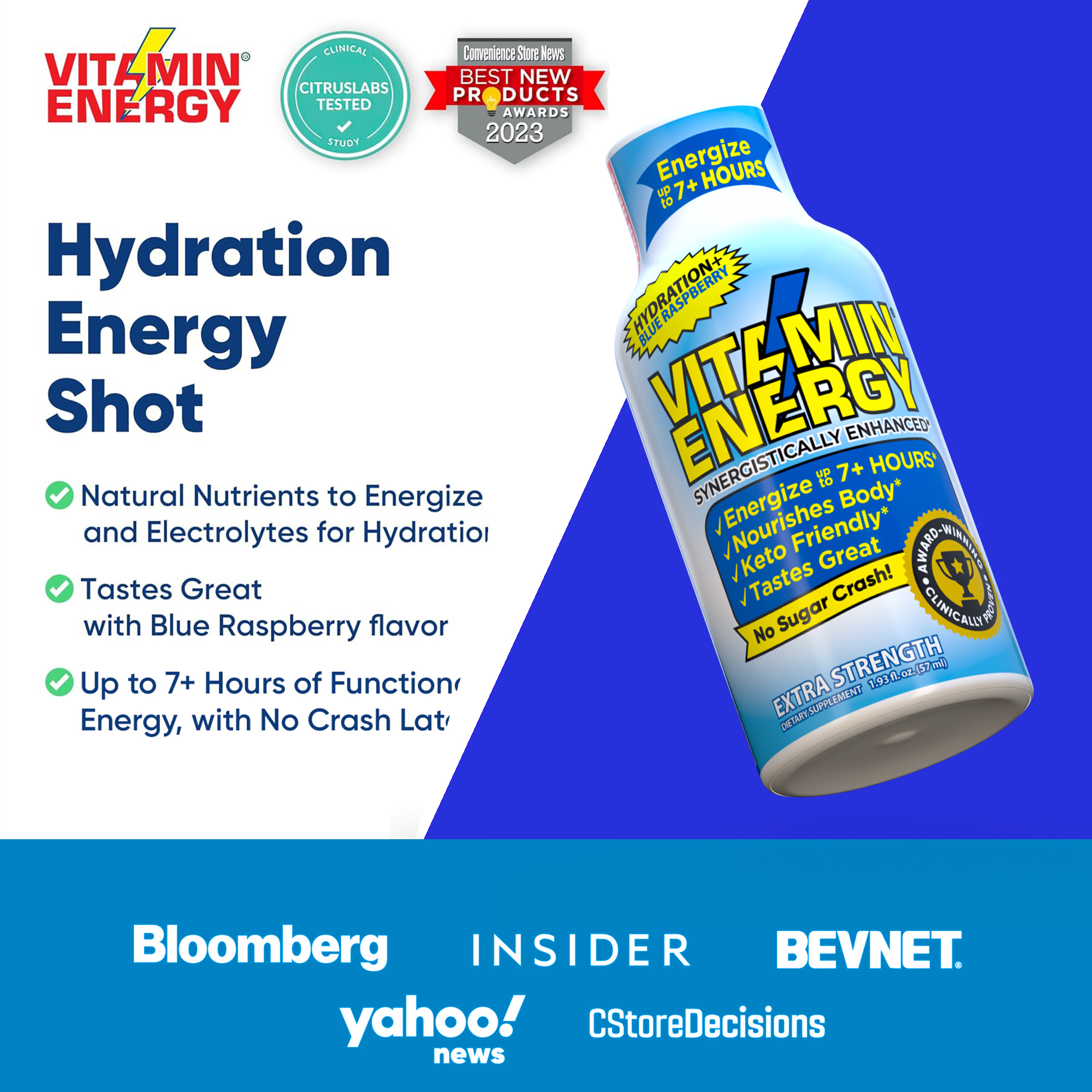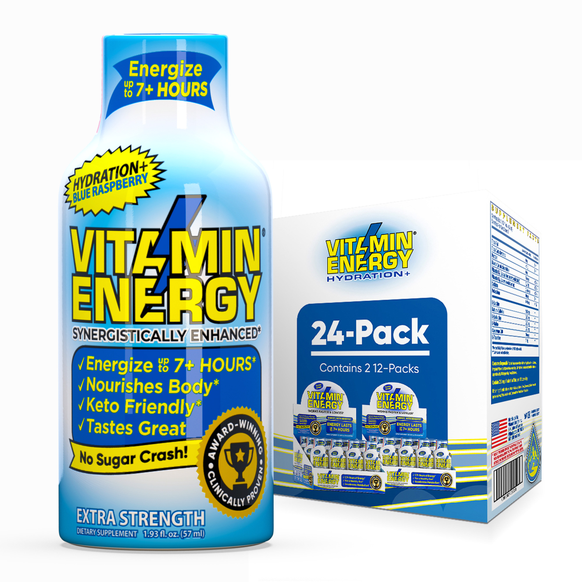 The Vitamin Energy® Hydration+ Blue Raspberry shot (1.93 fl. oz.) helps boost endurance and power with electrolytes and an assortment of vitamins and supplements. Each shot is sugar free and provides up to 7+ hours of naturally caffeinated energy, with no crash later. Kosher, Keto, & Vegan-Friendly. Natural caffeine.