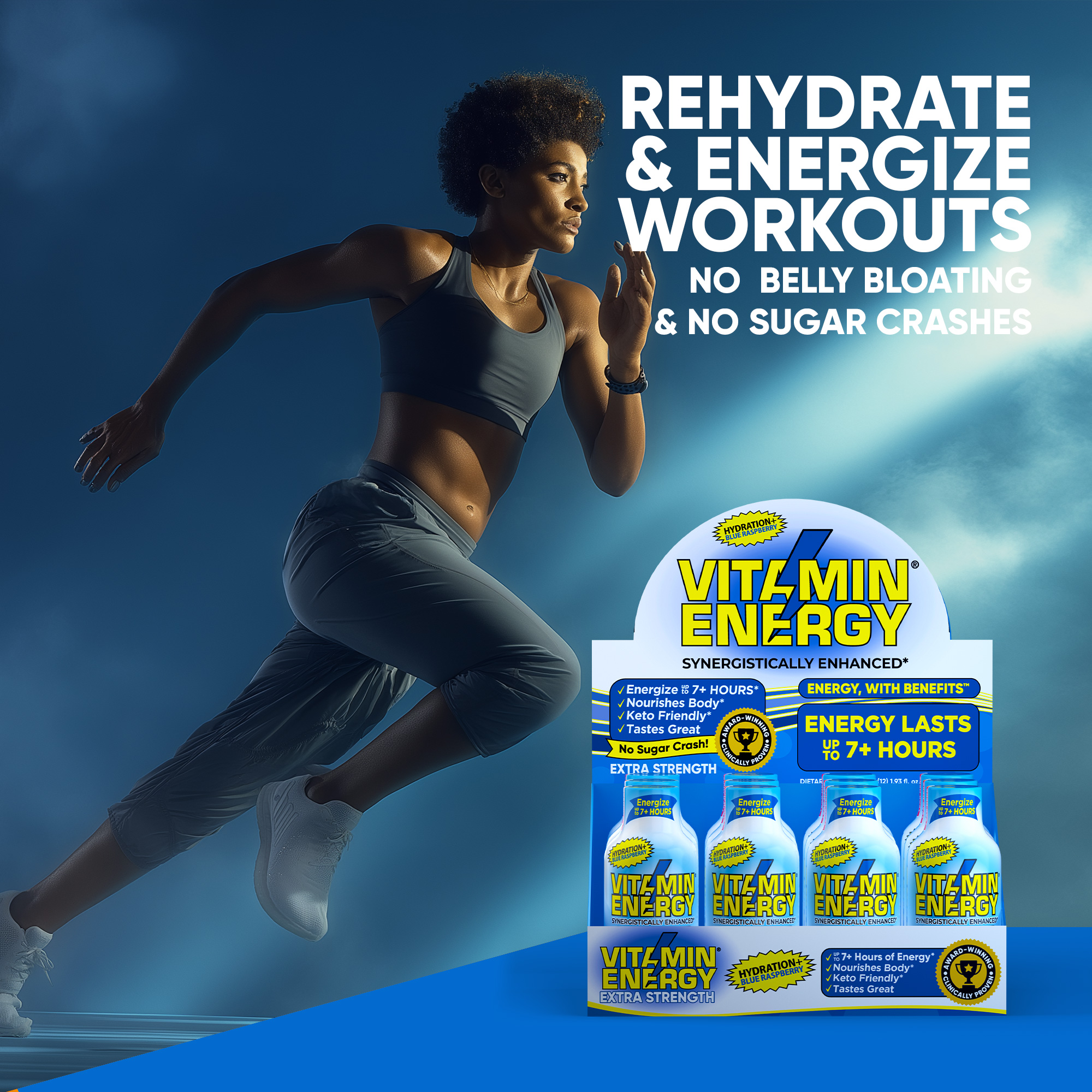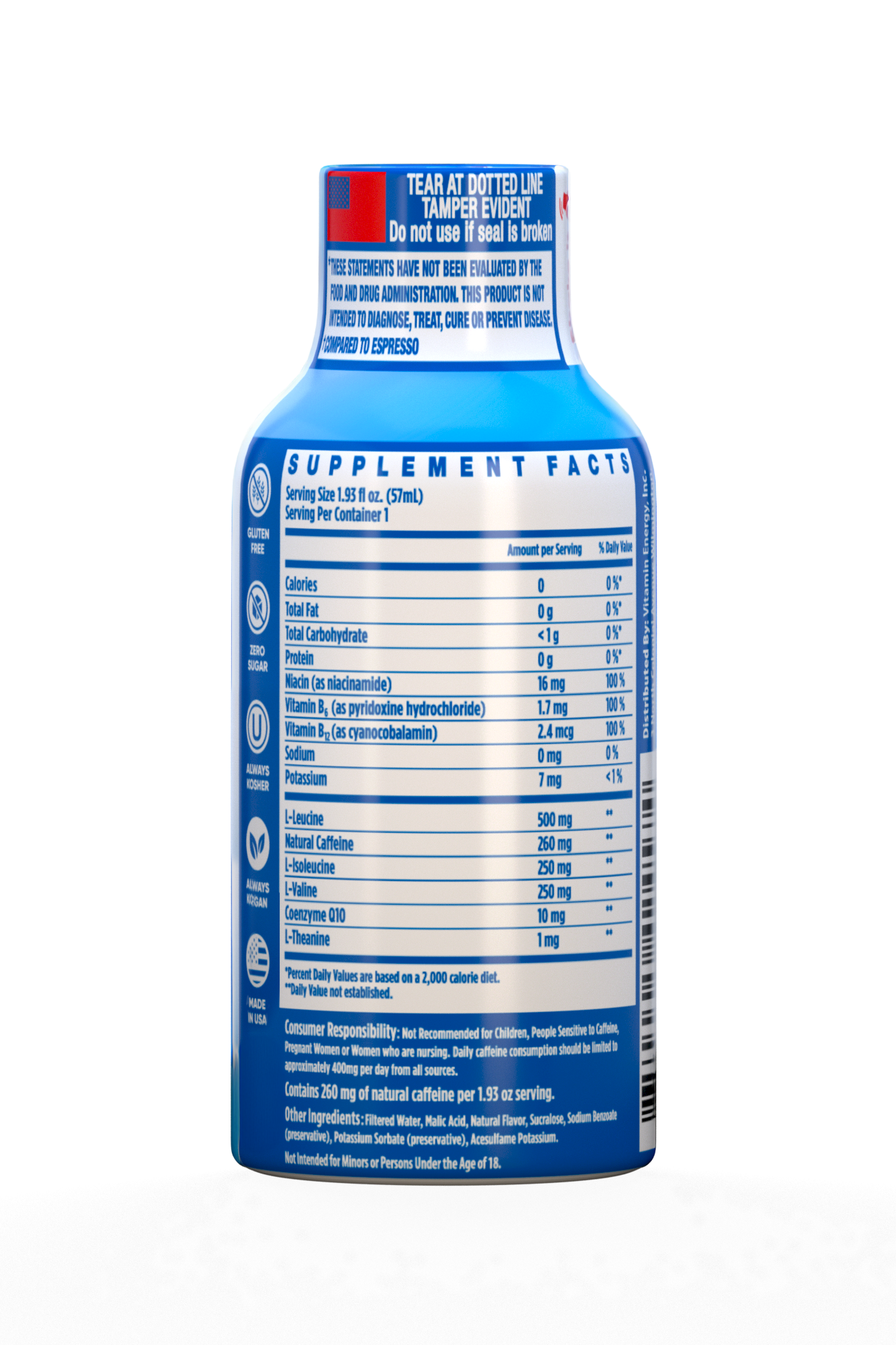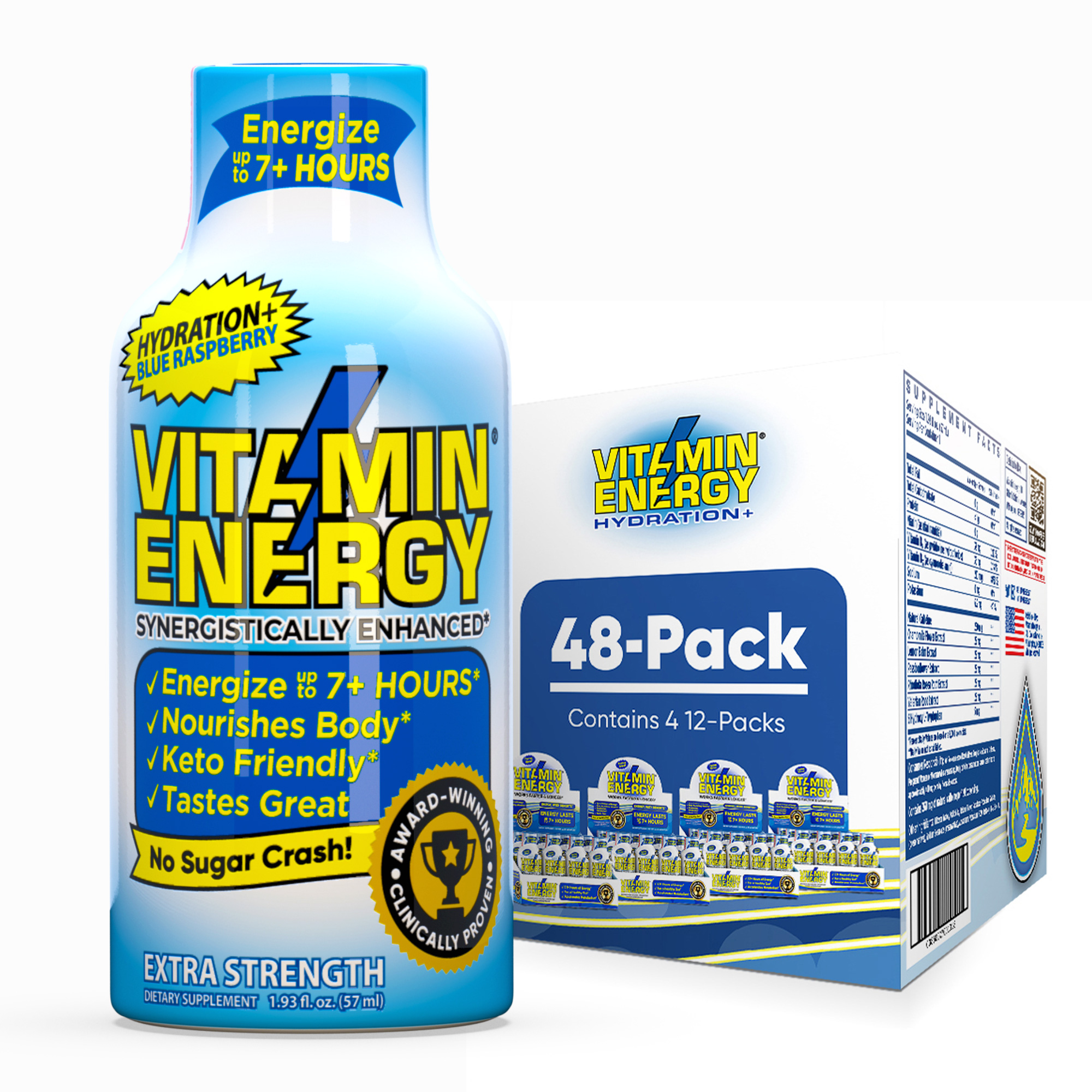 The Vitamin Energy® Hydration+ Blue Raspberry shot (1.93 fl. oz.) helps boost endurance and power with electrolytes and an assortment of vitamins and supplements. Each shot is sugar free and provides up to 7+ hours of naturally caffeinated energy, with no crash later. Kosher, Keto, & Vegan-Friendly. Natural caffeine.