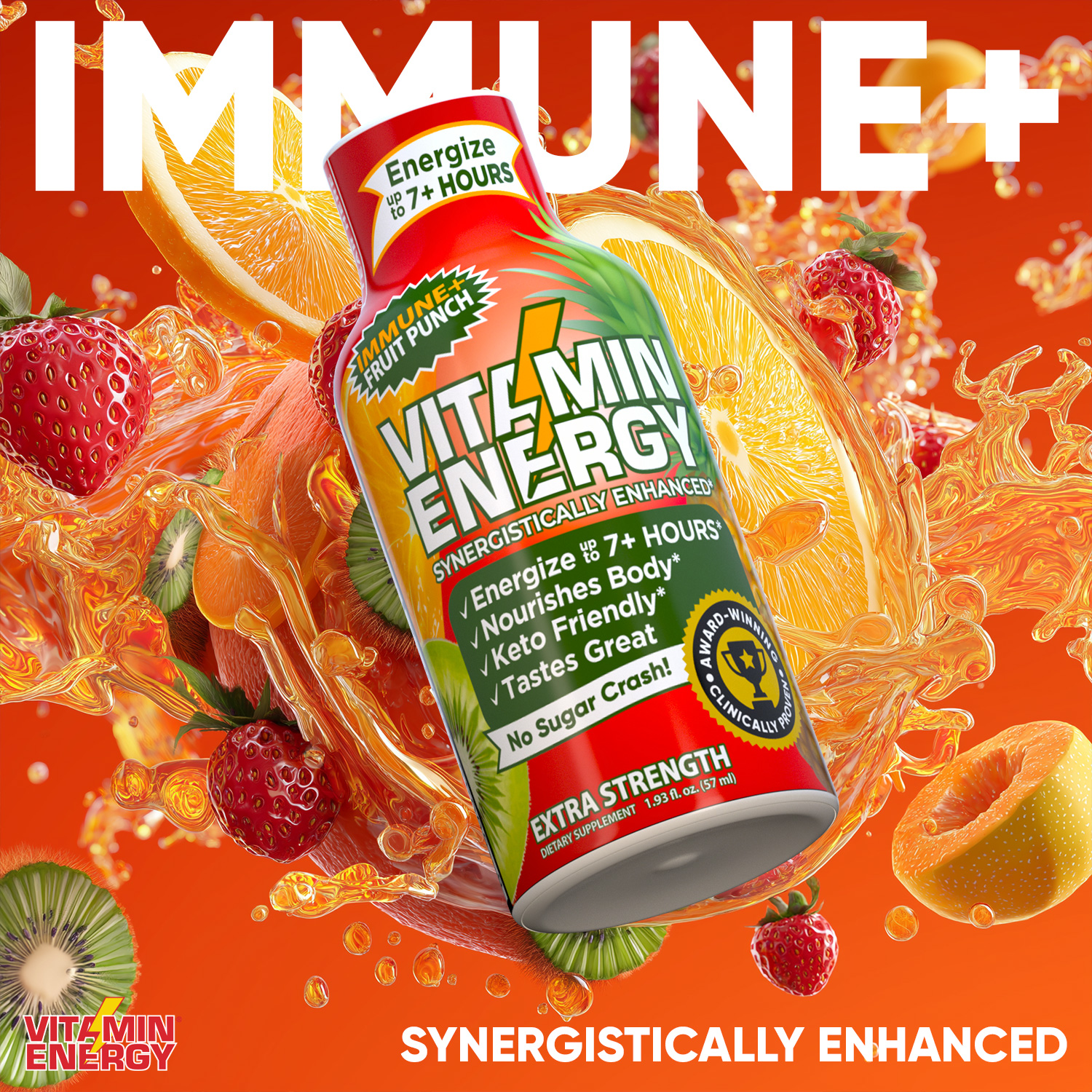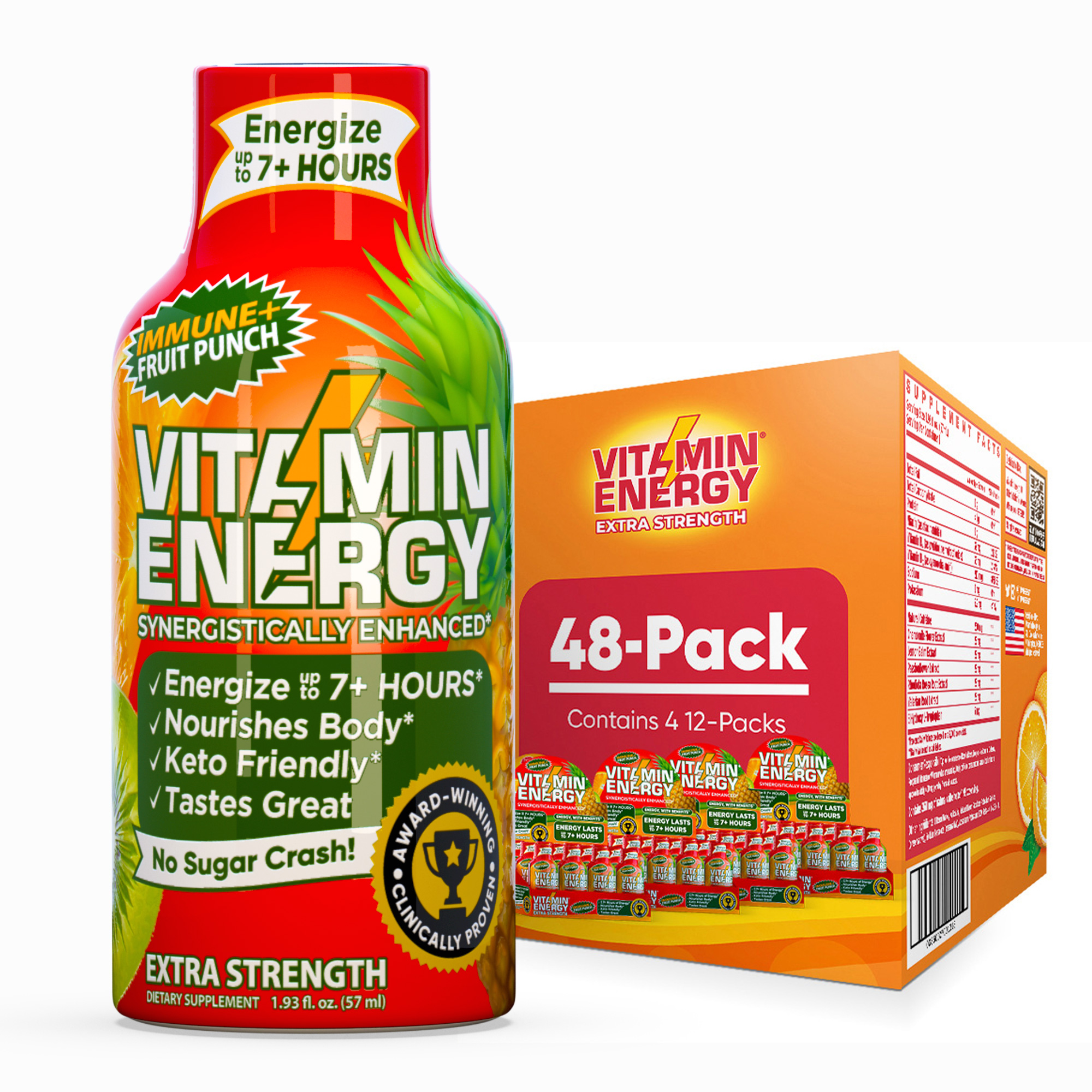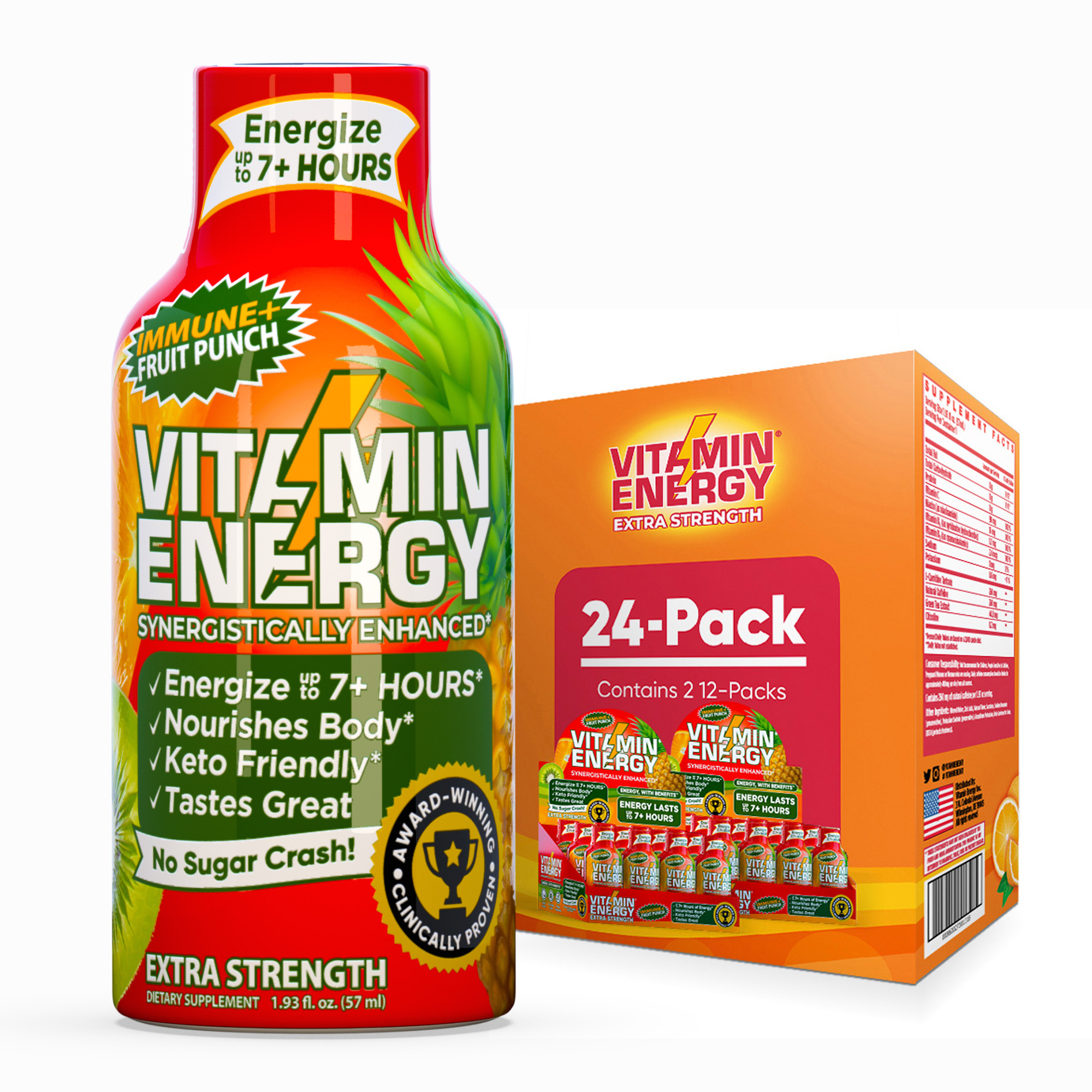 The Vitamin Energy® Immune+ Fruit Punch shot (1.93 fl. oz.) is filled with the ‘clinically proven’ vitamins needed to boost your immune health, while providing up to 7+ hours of naturally caffeinated energy with no crash later. No Sugar. Kosher, Keto, & Vegan-Friendly.