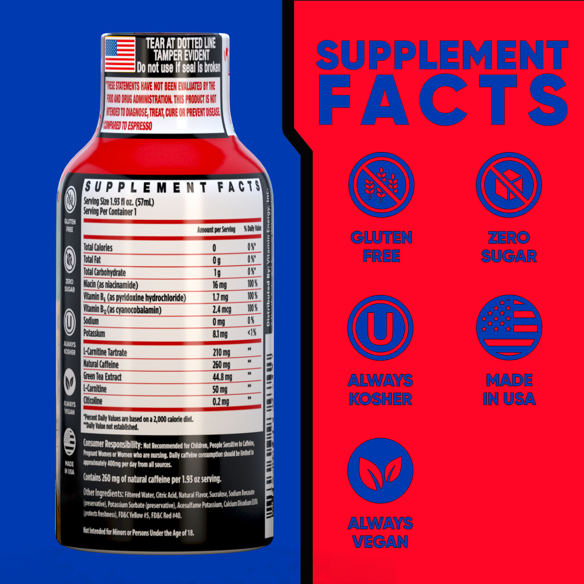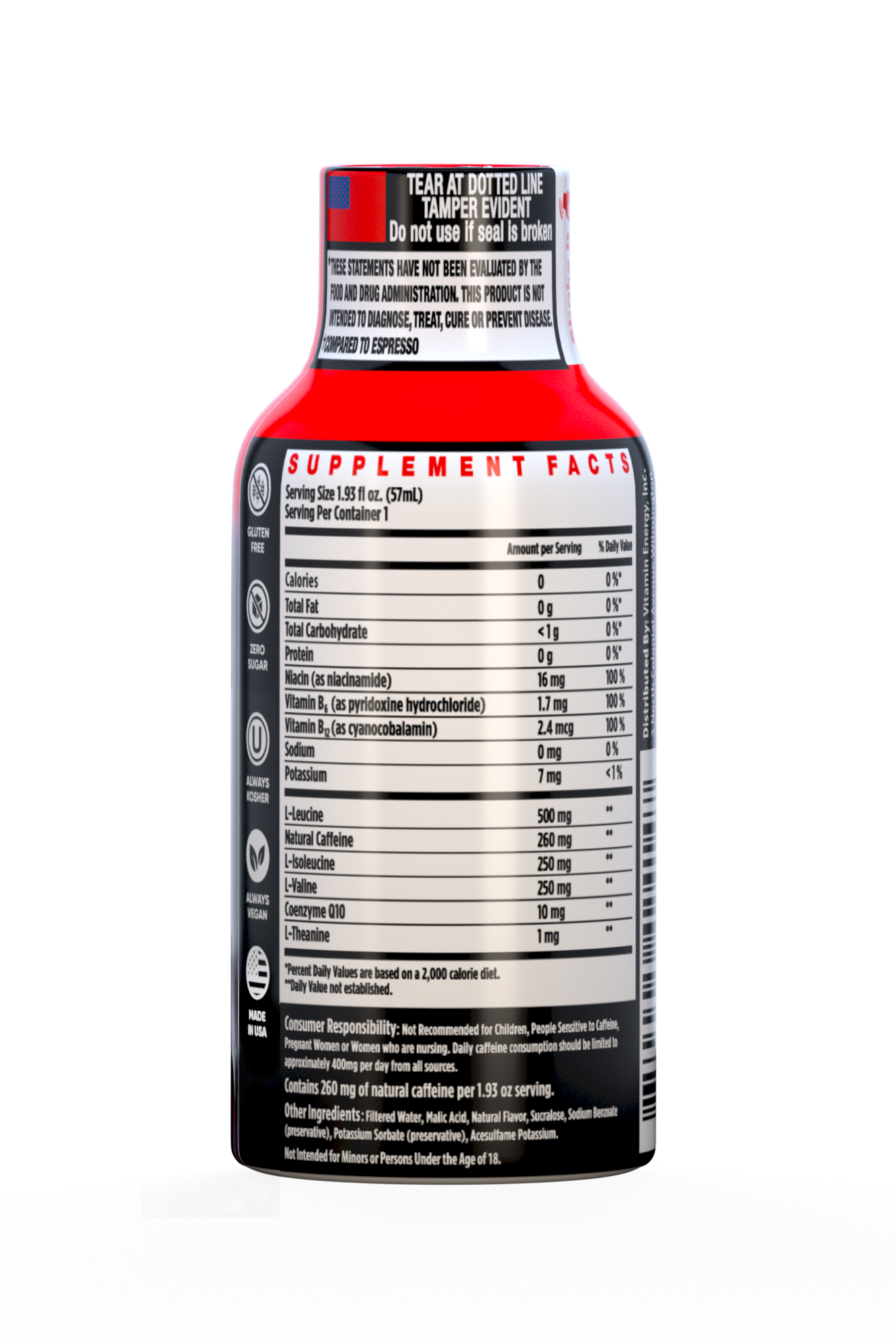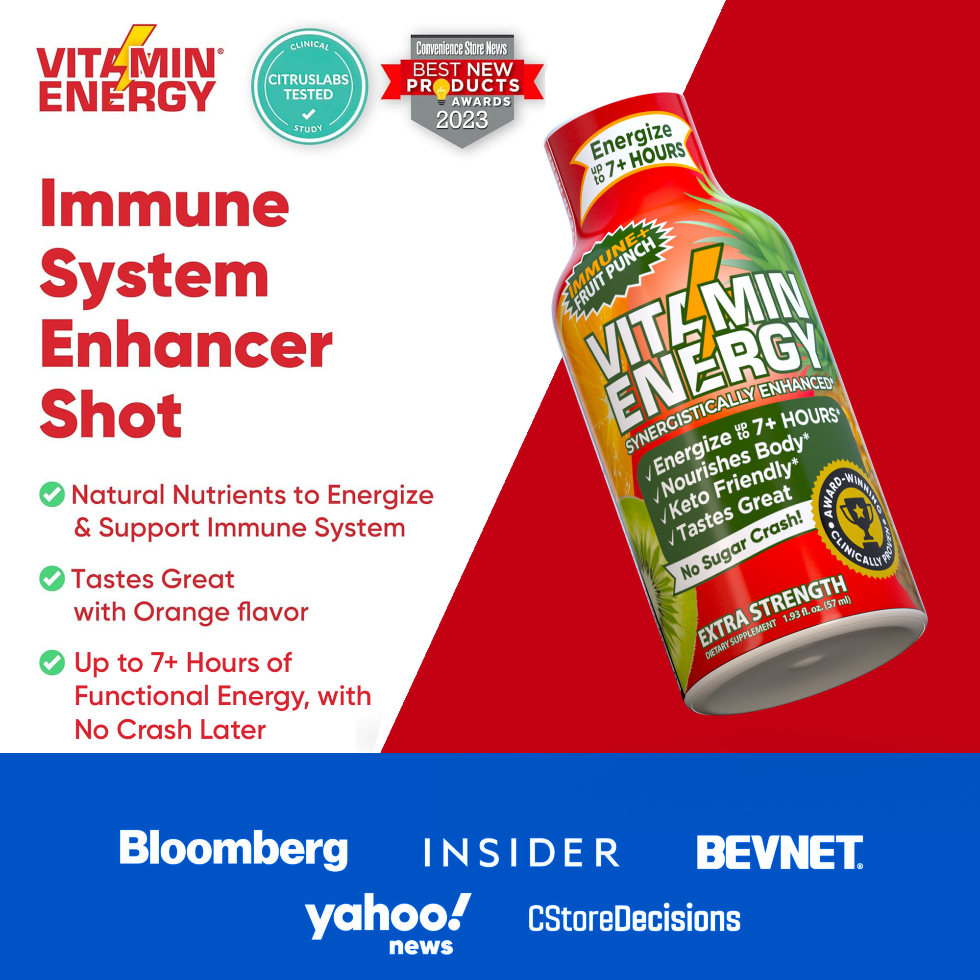 The Vitamin Energy® Immune+ Fruit Punch shot (1.93 fl. oz.) is filled with the ‘clinically proven’ vitamins needed to boost your immune health, while providing up to 7+ hours of naturally caffeinated energy with no crash later. No Sugar. Kosher, Keto, & Vegan-Friendly.