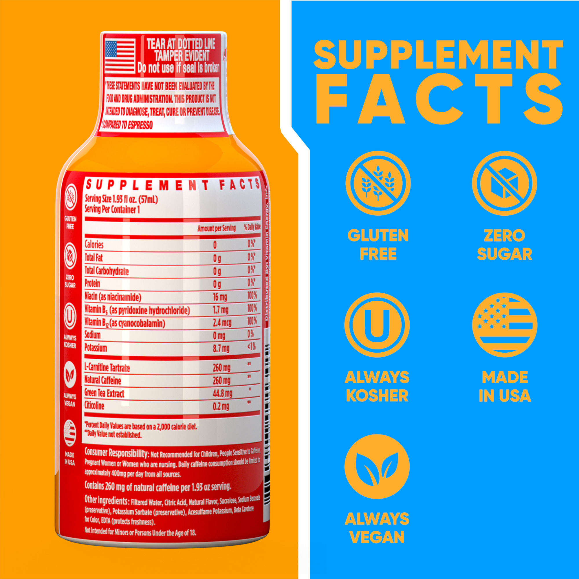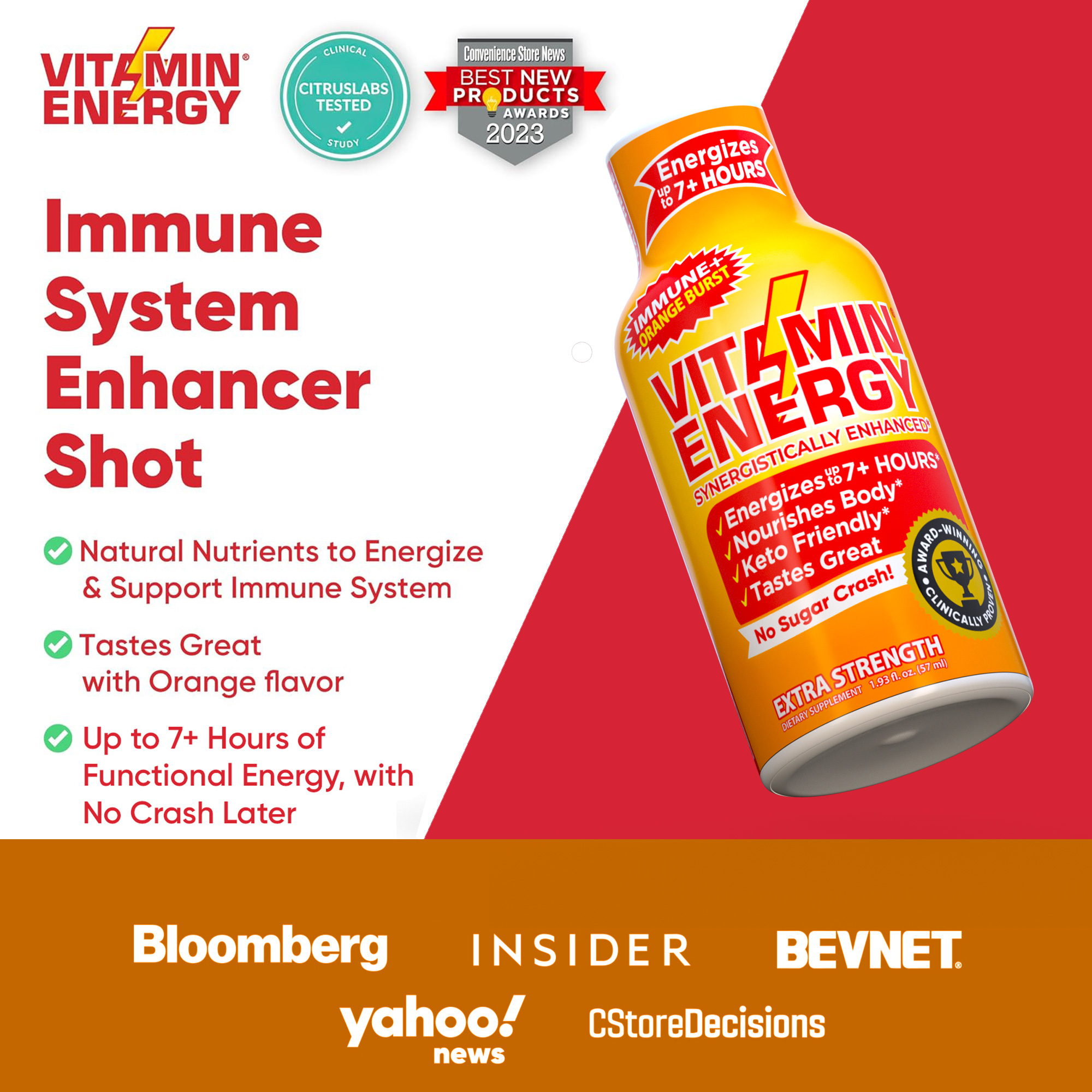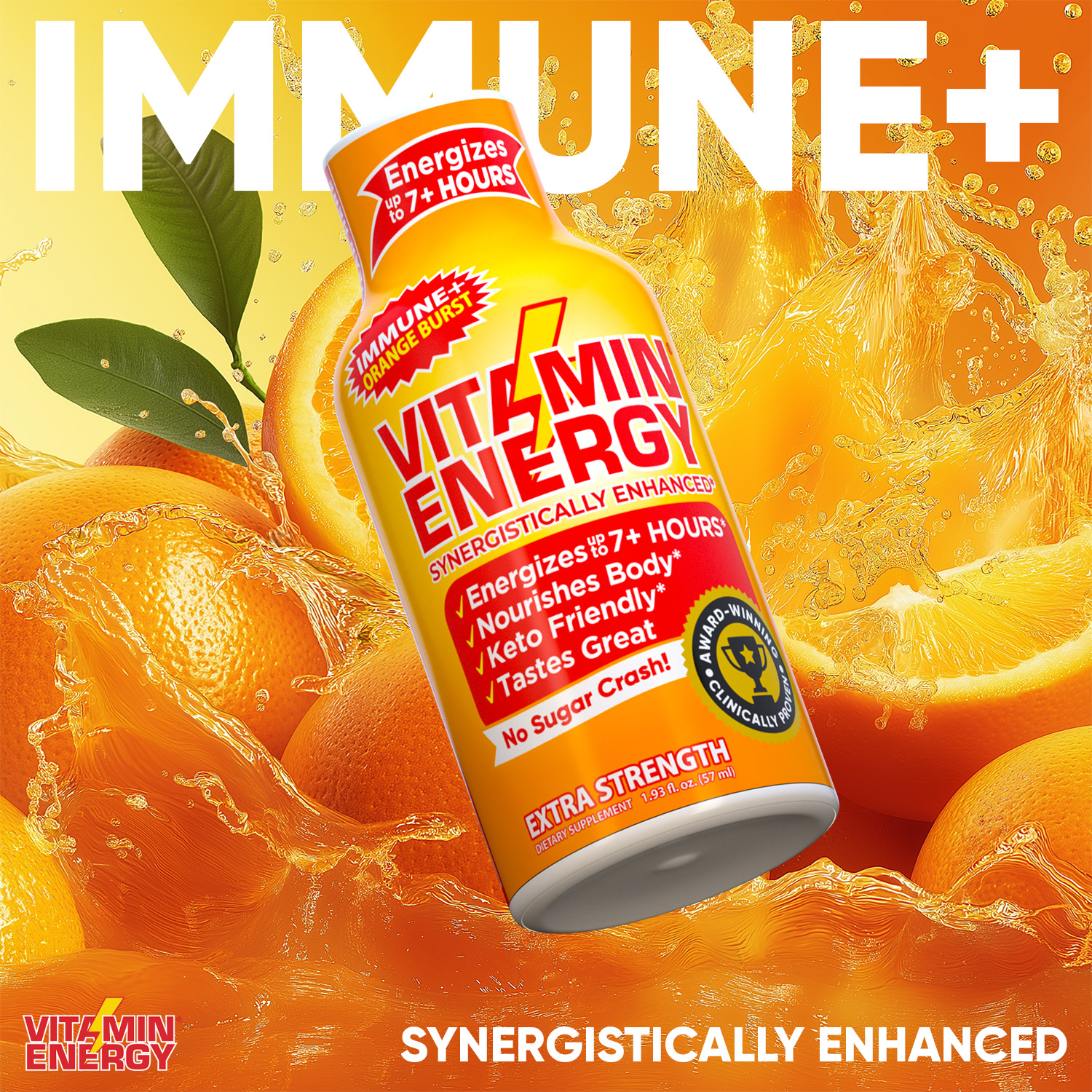 The Vitamin Energy® Immune+ Orange Burst shot (1.93 fl. oz.) is filled with the ‘clinically proven’ vitamins needed to boost your immune health, while providing up to 7+ hours of naturally caffeinated energy with no crash later. No Sugar. Kosher, Keto, & Vegan-Friendly.