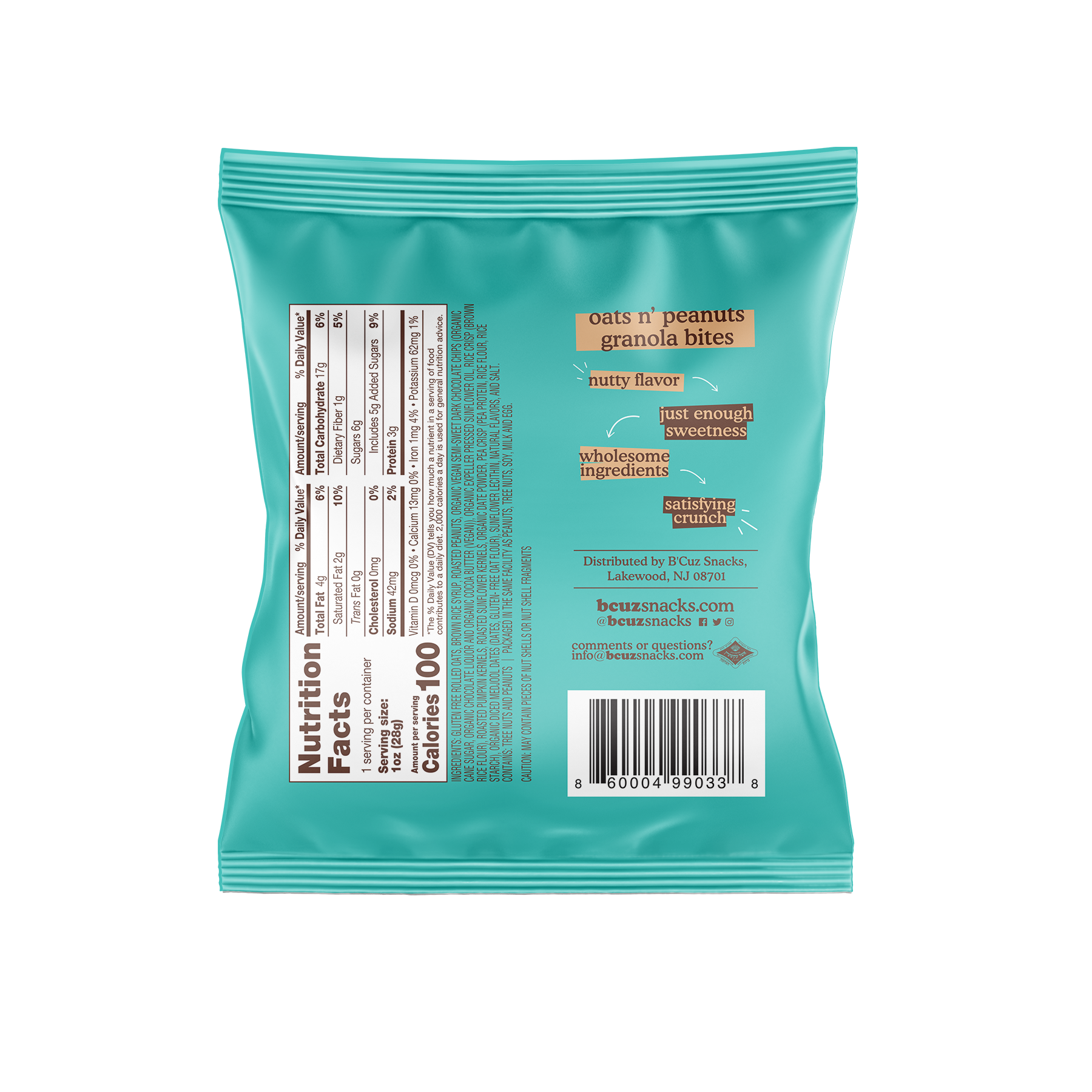 B'cuz it's delicious - Oats n’ Peanut Granola Bites are the boost you need! Enjoy this pack of granola bar bites made of oat clusters with classic peanut, chocolate, dates, and seeds for a sweet chewy crunch. Great for breakfast and all-day snacking. Healthy snacks for adults and yummy snacks for kids!