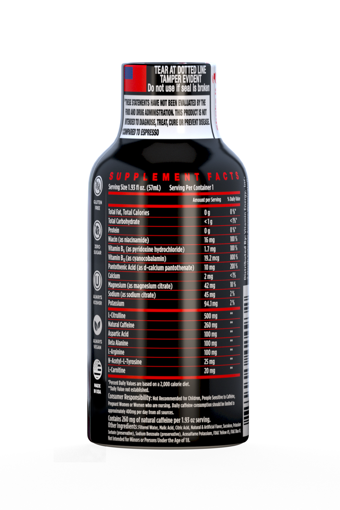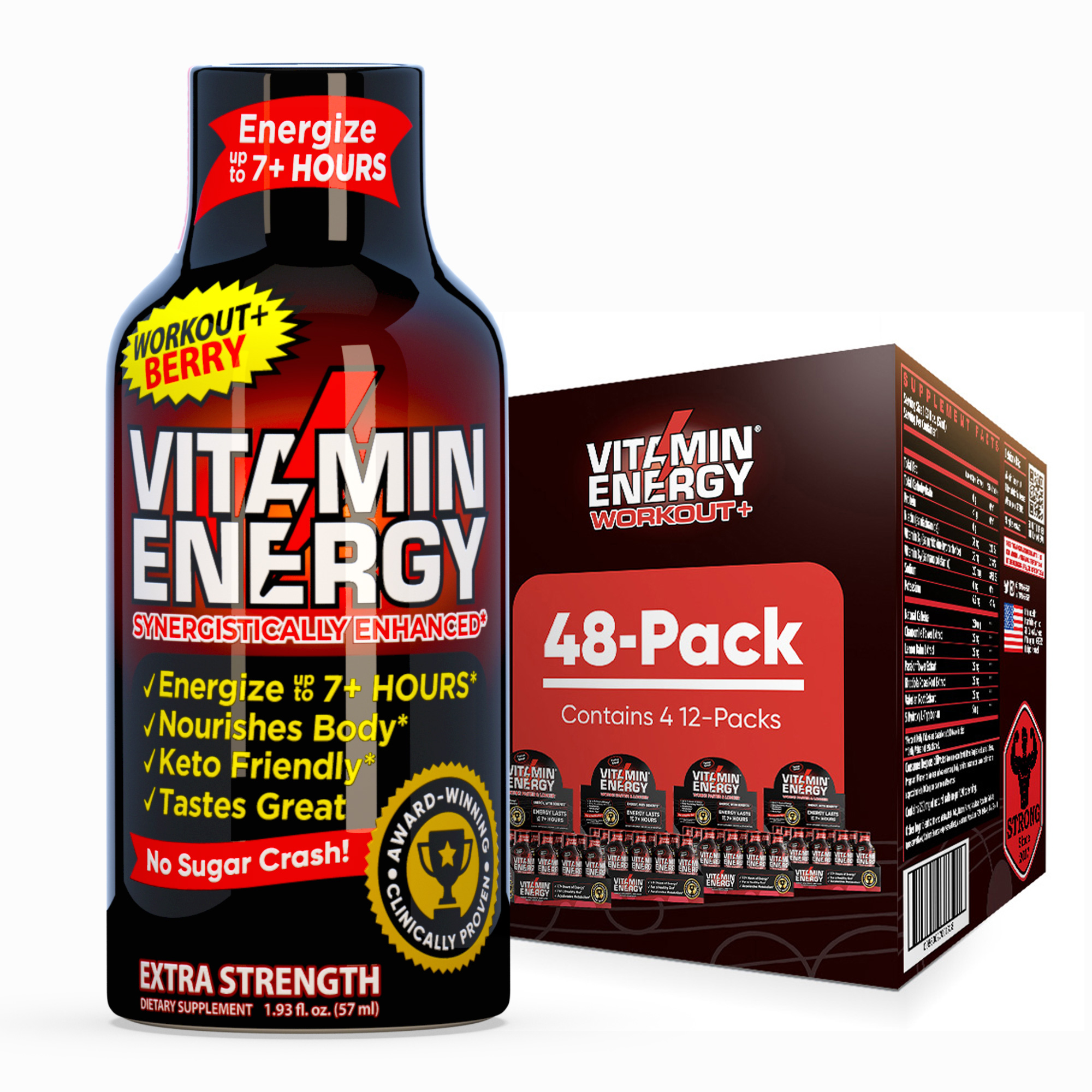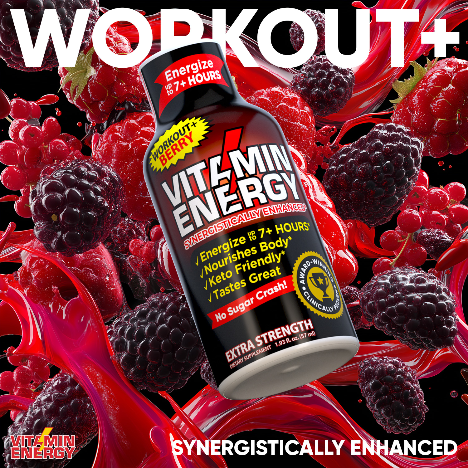 The Vitamin Energy® Workout+ Berry shot (1.93 fl. oz.) provides a clean pre-workout boost using L-arginine to assist with long-lasting performance and endurance. Each shot is sugar free and provides up to 7+ hours of naturally caffeinated energy, with no crash later. Kosher, Keto, & Vegan-Friendly.